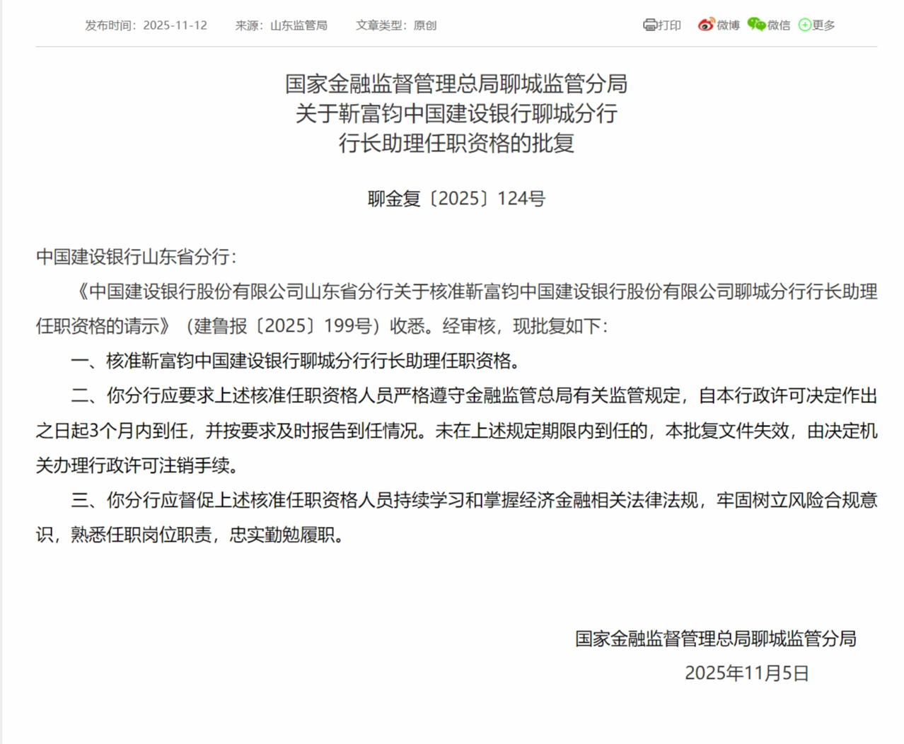 11月12日,国家金融监督管理总局聊城监管分局发布关于靳富钧中国建设银行聊城分行行长助理任职资格的批复,核准靳富钧中国建设银行聊城分行行长助理任职资格。